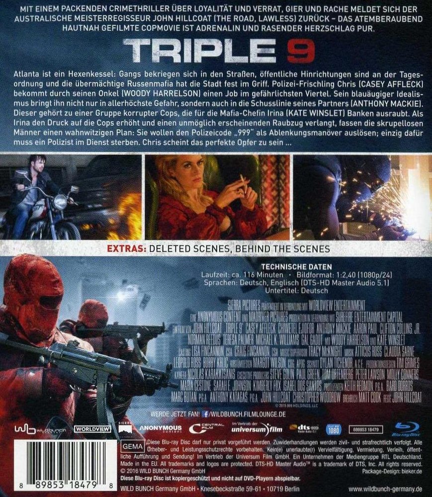 Mit öffentlichen Hinrichtungen, Straßenschlachten und brutaler Folter halten rivalisierende Gangs und die übermächtige Russenmafia Atlanta in ihrem tödlichen Griff. Frischling Chris Allen (Casey Affleck) bekommt durch seinen Onkel, Sergeant Detective Jeffrey Allen (Woody Harrelson), einen Job im gefährlichsten Viertel. Sein blauäugiger Idealismus bringt ihn nicht nur bei den gesetzlosen Gangstern in Gefahr, sondern auch in die Schusslinie seines neuen Partners Marcus Atwood (Anthony Mackie). Atwood gehört zu einer Gruppe von korrupten Bullen, die für die mächtige Russenmafia-Chefin Irina Vlaslov (Kate Winslet) Banken ausrauben. Als Irina den Druck auf die Cops erhöht und einen unmöglich erscheinenden Raubzug verlangt, fassen die abgebrühten Männer einen wahnwitzigen Plan: Sie wollen den Polizeicode '999' auslösen, um im anschließenden Chaos unbehelligt von den Kollegen, ihr Ding durchziehen zu können. Einzig dafür muss ein Polizist im Dienst sterben. Chris scheint das perfekte Opfer zu sein... Mit dem packenden Crimethriller 'Triple 9' (2016) über Loyalität und Verrat, Gier und Rache meldet sich der australische Meisterregisseur John Hillcoat (siehe 'The Proposition - Tödliches Angebot' 2005, 'The Road' 2009 und 'Lawless - Die Gesetzlosen' 2012) zurück. Dieser atemberaubend hautnah gefilmte Copmovie ist Adrenalin und rasender Herzschlag pur. Für den Trip in eine Hölle aus Korruption und organisiertem Verbrechen konnte er die Mitwirkung einer Riege herausragender Darsteller gewinnen, die von Casey Affleck ('Gone Baby Gone') angeführt wird. An dessen Seite spielen Woody Harrelson ('Die Tribute von Panem') und Oscar-Gewinnerin Kate Winslet ('Steve Jobs') in ihrer wohl ungewöhnlichsten Rolle als knallharte Anführerin eines Gangsterkartells. Mit von der Partie sind außerdem Chiwetel Ejiofor ('12 Years a Slave'), Anthony Mackie (Marvels 'The Avengers 2 - Age of Ultron'), Norman Reedus ('The Walking Dead') und Aaron Paul ('Breaking Bad'), allesamt Garanten für Spitzen(Heim-)kino der Sonderklasse.