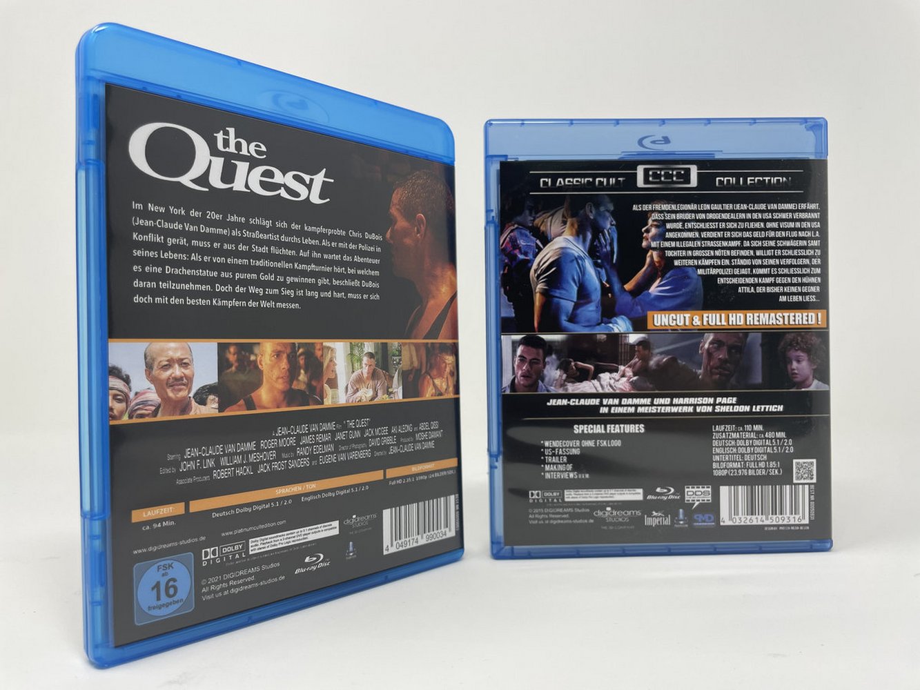 "Leon" Er will die Mörder seines Bruders finden. In der Unterwelt macht er sich bald durch sein Talent im Kickboxen einen Namen. Sein Charisma und sein Ruhm sind der "Lady", die bisher absolute Herrscherin war, ein Dorn im Auge. Sie arrangiert einen Kampf, zwischen dem Franzosen und dem unbezwingbaren Champion...! Doch Leon steht auch nach blutigen Niederlagen immer noch im Ring... Laufzeit ca. 110 Minuten Produktionsjahr 1990 / USA Regie Sheldon Lettich "The Quest" Der kleine Straßenganove Chris DuBois ist der Anführer einer Bande verwaister Straßenkinder im New York der 1920er Jahre. Auf der Flucht vor der Polizei landet er eines Tages im Laderaum eines Hochseefrachters. Damit beginnt für den kampferprobten Lebenskünstler eine gefahrvolle Odyssee, die ihn bis ins südchinesische Meer verschlägt. Dort findet auf einer Insel ein geheimes, Jahrtausende altes Kampfturnier statt, dessen Gewinner eine Drachenstatue aus purem Gold erhält. Laufzeit ca. 94 Minuten Produktionsjahr: 1996 / USA Regie: Jean Claude van Damme FSK 16