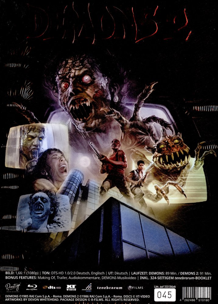 Inhaltsangabe: Komm, wir geh’n ins Kino! Diesem Ruf folgen auch zwei junge Damen, zumal es Freikarten gibt. Doch nur der Tod ist umsonst. Das sollen die Besucher eines Berliner Kinos am eigenen Leibe spüren, als das Grauen auf der Leinwand im Saal tödliche Realität wird und Zuschauer zu Opfern macht … und zu Dämonen. In der Fortsetzung gibt es den Horror frei Haus über das heimische Fernsehgerät … Mit seinen Dämonen-Filmen schuf Lamberto Bava gegen Ende der goldenen Ära des italienischen Genrefilms noch einmal zwei bemerkenswerte Filme, wobei Dèmoni mit seinem brillanten Spiel mit verschiedenen Ebenen gar als ein – oftmals unterschätztes – Meisterwerk bezeichnet werden kann. Die unter der schillernden Oberfläche verborgenen Qualitäten werden im 324-seitigen tenebrarum-Buchteil von Martin Beine mit gewohnter Präzision analysiert. Ausgestattet mit umfangreichem und zum Teil sehr seltenem Bildmaterial, wird das Mediabook selbst zu einem absoluten Hingucker. Bonus Features (DEMONS 2): -Making Of -Trailer -Audiokommentar Die Cover-Varianten enthalten jeweils ein 324-seitiges tenebrarum-Booklet mit teils sehr seltenem Bildmaterial.
