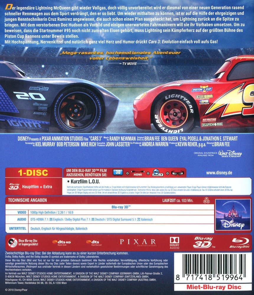 Der legendäre Lightning McQueen gibt wieder Vollgas, doch völlig unvorbereitet wird er diesmal von einer neuen Generation rasend schneller Rennwagen aus dem Sport verdrängt, den er so liebt. Um wieder mithalten zu können, ist er auf die Hilfe der ehrgeizigen und jungen Renntechnikerin Cruz Ramirez angewiesen, die auch schon einen Plan ausgeheckt hat, um Lightning zurück an die Spitze zu bringen. Mit dem verstorbenen Doc Hudson als Vorbild und einigen unerwarteten Fahrmanövern will sie ihr Vorhaben umsetzen. Um zu beweisen, dass die Startnummer #95 noch nicht zum alten Eisen gehört, muss Lightning sein Kämpferherz auf der größten Bühne des Piston Cup Rennens unter Beweis stellen. Mit Hochspannung, Nervenkitzel und natürlich ganz viel Herz und Humor drückt Cars 3: Evolution einfach voll aufs Gas!
