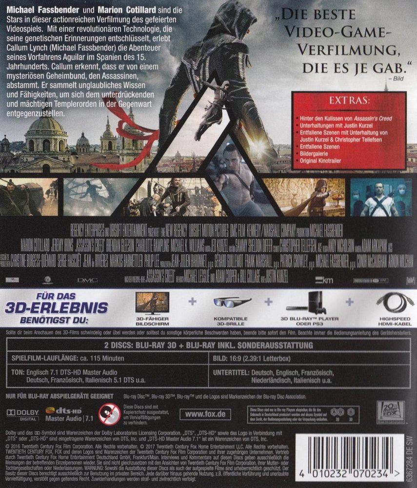 Mit einer revolutionären Technologie, die seine genetischen Erinnerungen entschlüsselt, erlebt Callum Lynch (Michael Fassbender) die Abenteuer seines Vorfahren Aguilar im Spanien des 15. Jahrhunderts. Callum erkennt, dass er von einem mysteriösen Geheimbund, den 'Assassinen', abstammt und sammelt unglaubliches Wissen und Fähigkeiten, um sich dem unterdrückenden und mächtigen Templerorden in der Gegenwart entgegenzustellen... Die Hauptrollen in 'Assassin's Creed' (2016) übernahmen der Oscar-nominierte Michael Fassbender ('X-Men - Zukunft ist Vergangenheit', '12 Years a Slave') und Oscar-Preisträgerin Marion Cotillard ('Batman - The Dark Knight Rises', 'La Vie en Rose'). Justin Kurzel ('Snowtown', 'Macbeth') führt Regie. Die Verfilmung des weltweiten Games-Hits von 'Ubisoft' wurde von 'New Regency', 'Ubisoft Motion Pictures', 'DMC Films' und 'Kennedy/Marshall' produziert , kofinanziert von 'RatPac Entertainment' und 'Alpha Pictures' und von '20th Century Fox' in die Kinos gebracht. Das 'Assassin's Creed' Filmabenteuer begann am 27. Dezember 2016 in den deutschen Kinos und ist seitdem auch hier auf DVD, Blu-ray, Blu-ray 3D sowie 4K UHD im Verleihprogramm zu erleben.