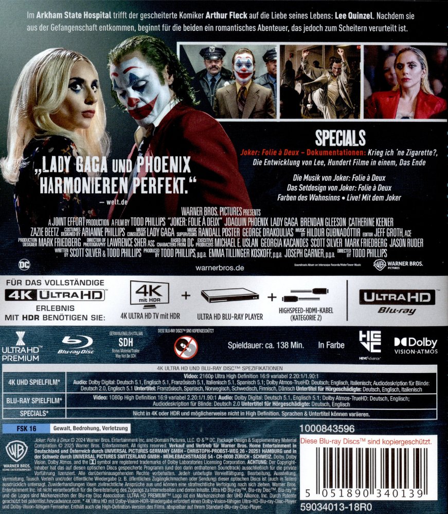 Im Arkham State Hospital trifft der gescheiterte Komiker Arthur Fleck auf die Liebe seines Lebens: Lee Quinzel. Nachdem sie aus der Gefangenschaft entkommen, beginnt für die beiden ein romantisches Abenteuer, das jedoch zum Scheitern verurteilt ist."Lady Gaga und Phoenix harmonieren perfekt" (welt.de)