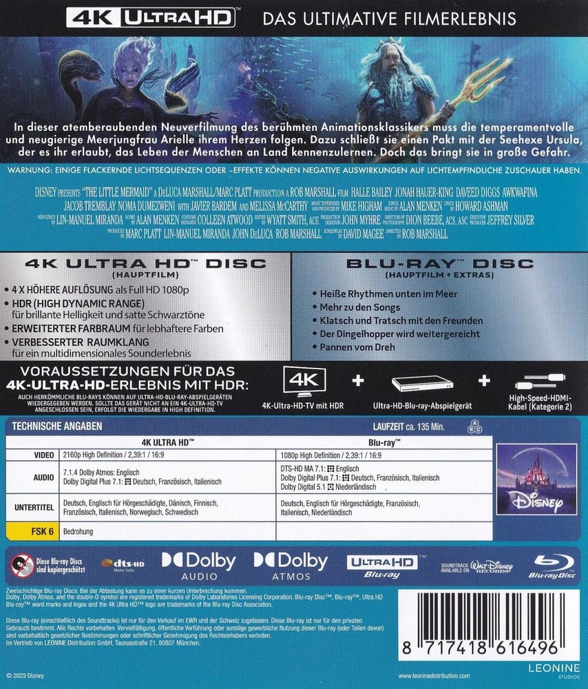 'Arielle die Meerjungfrau' (2023), Disneys Live-Action-Verfilmung des Oscar-gekrönten Zeichentrickklassikers über eine der beliebtesten Filmfiguren aller Zeiten, visionär neuinszeniert von Regisseur Rob Marshall, erzählt von der schönen und temperamentvollen jungen Meerjungfrau Arielle und ihrem unstillbaren Durst nach Abenteuern. Arielle (Halle Bailey), die jüngste und eigenwilligste Tochter von König Triton (Javier Bardem), sehnt sich danach, mehr über die Welt jenseits des Meeres zu erfahren und verliebt sich bei einem Besuch an der Oberfläche in den attraktiven Prinz Erik (Jonah Hauer-King). Obwohl Meerjungfrauen der Umgang mit Menschen verboten ist, muss Arielle ihrem Herzen folgen. Und so geht sie einen Pakt mit der bösen Meerhexe Ursula (Melissa McCarthy) ein, der ihr zwar die Chance gibt, das Leben an Land kennenzulernen, aber letztlich ihr Leben und die Krone ihres Vaters bedroht.