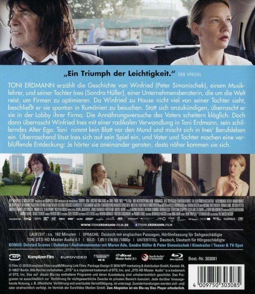 'Toni Erdmann' erzählt die Geschichte von Winfried Conradi (Peter Simonischek), einem Musiklehrer mit einem ausgeprägtem Hang zum Scherzen, und seiner Tochter Ines (Sandra Hüller), einer Karrierefrau, die um die Welt reist, um Firmen zu optimieren. Da Winfried zu Hause nicht viel von seiner Tochter sieht, beschließt er, sie spontan bei ihrem großem Outsourcing-Projekt in Rumänien zu besuchen. Statt sich anzukündigen, überrascht er sie mit Scherzgebiss und Sonnenbrille in der Lobby ihrer Firma. Ines bemüht sich, gute Miene zum bösen Spiel zu machen und schleppt ihren Vater in seinen alten Jeans mit zu Businessempfängen und Massageterminen. Der Besuch führt jedoch nicht zu einer Annäherung. Winfried nervt seine Tochter mit lauen Witzen und unterschwelliger Kritik an ihrem leistungsorientierten Leben zwischen Meetings, Hotelbars und unzähligen E-Mails. Es kommt zum Eklat zwischen den beiden... 'Toni Erdmann', der gefeierte Film der Regisseurin Maren Ade (siehe 'Der Wald vor lauter Bäumen' 2004 und 'Alle Anderen' 2009), erlebte seine Weltpremiere im Wettbewerb des 69. 'Festival International du Film' in Cannes, der bundesweite Kinostart in Deutschland fand am 14. Juli 2016 statt.
