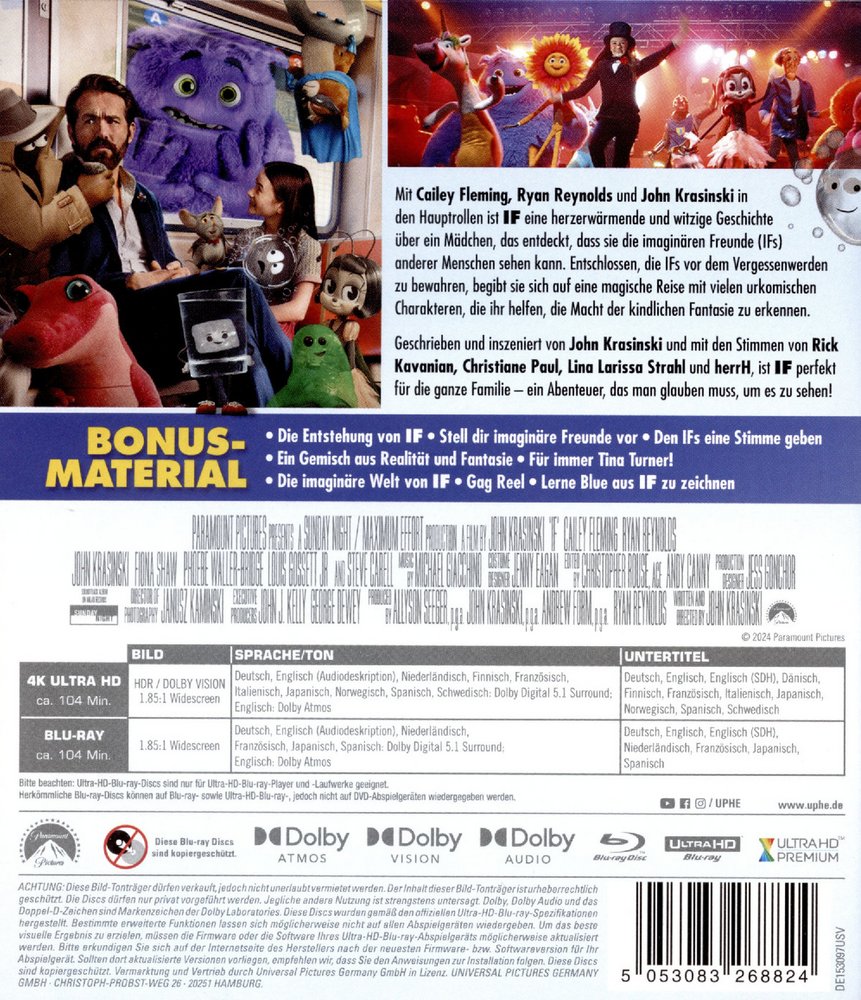 Mit Cailey Fleming, Ryan Reynolds und John Krasinski in den Hauptrollen ist "IF" eine herzerwärmende und witzige Geschichte über ein Mädchen, das entdeckt, dass sie die imaginären Freunde (IFs) anderer Menschen sehen kann. Entschlossen, die IFs vor dem Vergessenwerden zu bewahren, begibt sie sich auf eine magische Reise ... mehr »