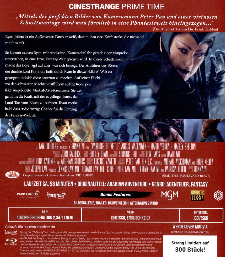 Ryan Jeffers ist ein Außenseiter. Doch er weiß, dass in ihm eine Kraft steckt, die niemand mit ihm teilt. So kommt es, dass Ryan, während seine „Kameraden“ ihn gerade einer Mutprobe unterziehen, in eine ferne Fantasy-Welt gesogen wird. In dieser Schattenwelt macht das Böse Jagd auf alles, was sich bewegt. Der Anführer des Bösen, der dunkle Lord Komodo, hofft durch Ryan in die „wirkliche“ Welt zu gelangen und sich diese untertan zu machen. Auf seiner Flucht vor den schwarzen Mächten trifft Ryan auf die Roos, perfekt ausgebildete Martial-Arts-Kreaturen. Sie zeigen ihm die Kraft, mit der es gelingen kann, das Land Tao vom Bösen zu befreien. Ryan merkt bald, dass er die einzige Chance für die Rettung der Fantasy-Welt ist. CINESTRANGE EXTREME präsentiert als Nummer 05 der Prime Time-Reihe das groß-budgetierte Fantasy-Spektakel CREATURE ZONE (WARRIORS OF VIRTUE), das für Meister-Regisseur Ronny Yu (BORN HERO, DAS UNBESIEGBARE SCHWERT) die Fahrkarte nach bzw den Durchbruch in Hollywood bedeutete. Sein nächster Film war CHUCKY UND SEINE BRAUT, und kurz danach folgte schon sein Kult-Hit FREDDY VS JASON. In Komponist Don Davis' Vita findet man u.a. die MATRIX-Trilogie, Starkameramann Peter Pau (OscarTM für TIGER & DRAGON) sorgte für die grandiosen Bilder, und auch im Bereich der Stunts umgab man sich mit eingefleischten Routiniers (DOUBLE TEAM, BULLETPROOF MONK und erneut TIGER & DRAGON). Der Schnitt von David Wu rundet die illustre, durchweg professionelle Runde ab: auf sein Konto gehen HARDBOILED und PAKT DER WÖLFE. Die restlichen Departments warten mit ähnlichen Kalibern an Bekanntheitsgraden auf. Hierzulande handelt es sich um die erste Veröffentlichung des Films auf einem digitalen Medium und stellt gleichzeitig dessen HD-Weltpremiere dar. Die neue Abtastung bietet etwa 50% mehr Bildinformation!