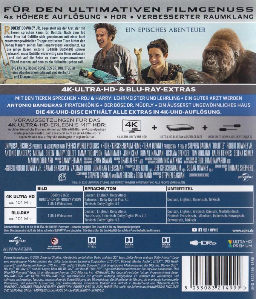Nach dem Verlust seiner geliebten Frau vergräbt sich der exzentrische englische Tierarzt Dr. John Dolittle (Robert Downey Jr.) hinter den Mauern des 'Dolittle Manor', wo ihn nur eine Schar von Tieren Gesellschaft leistet. Doch als die junge Queen Victoria (Jessie Buckley) von einer mysteriösen Krankheit heimgesucht wird, muss sich Dr. Dolittle auf eine abenteuerliche Reise zu einer entlegenen Insel begeben, um ein mögliches Heilmittel für die Königin zu finden... Im Dolittle-Remake 'Die fantastische Reise des Dr. Dolittle' (2020) mit vielen weiteren Stars wie Antonio Banderas als King Rassouli, Michael Sheen als Dr. Blair Müdfly oder Jim Broadbent als Lord Thomas Badgley unter der Regie von Stephen Gaghan (siehe auch 'Syriana' 2005 und 'Gold' 2016), ab 30. Januar 2020 bundesweit in den deutschen Kinos und anschließend auch hier im Verleihprogramm für das eigene Heimkino!