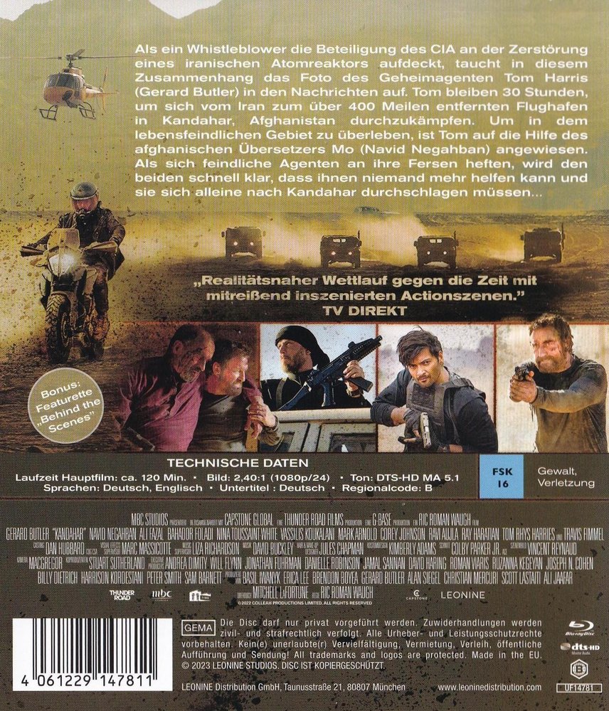 Als ein 'Whistleblower' die Beteiligung des 'CIA' an der Zerstörung eines iranischen Atomreaktors aufdeckt, taucht das Gesicht des Geheimagenten Tom Harris (Gerard Butler), der den Reaktor sabotiert hat, in den Nachrichten auf. Tom bleiben genau 30 Stunden, um sich vom Iran zum über 400 Meilen entfernten Flughafen nach 'Kandahar' in Afghanistan durchzukämpfen. Um in dem lebensfeindlichen Gebiet zu überleben, ist Tom auf die Hilfe des afghanischen Übersetzers Mo (Navid Negahban) angewiesen. Doch Mo, dessen Sohn von den 'Taliban' getötet wurde, verabscheut das Blutvergießen und gibt den 'Warlords' und den westlichen Streitkräften die Schuld daran, es am Laufen zu halten. Als sich feindliche Agenten, darunter die iranische Revolutionsgarde und der eiskalte Killer Kahil (Ali Fazal), an ihre Fersen heften, wird den beiden klar, dass ihnen ab diesem Punkt niemand mehr helfen kann. Tom und Mo schließen sich zusammen, um sich nach 'Kandahar' durchzuschlagen... In dem spannungsgeladenen Actioner 'Kandahar' (2023) von Regisseur Ric Roman Waugh bleiben Gerard Butler als Undercover-Agent Tom Harris nur 30 Stunden Zeit, um 400 Meilen zu einer CIA-Basis in Kandahar zu fliehen. Ein atemloser Wettlauf ums Überleben. Der Black-Ops-Agent muss nach einer geplatzten Undercover-Mission im Iran nach Kandahar in Afghanistan fliehen, von wo aus ihn ein Flugzeug in Sicherheit bringen soll. Filmemacher Waugh garantiert in seiner dritten Zusammenarbeit mit Butler erneut spektakuläre Action mit rasanten Verfolgungsjagden und explosiven Kampfszenen. 'Kandahar' trumpft dabei mit einem realitätsnahen Szenario auf. Das authentische Drehbuch stammt von Mitchell LaFortune, der selbst an mehreren Einsätzen des Nachrichtendienstes 'DIA' in Afghanistan beteiligt war. Die Hauptrollen spielen Butler ('Greenland', 'Angel Has Fallen', 'Plane'), Navid Negahban (aus den Serien 'Homeland' und 'Legion'), Ali Fazal ('Tod auf dem Nil'), Bahador Foladi (aus der Streaming-Serie 'Tehran'), Travis Fimmel (TV-Serie 'Vikings') und Nina Toussaint-White (TV-Serie 'Bodyguard'). Regie führte Ric Roman Waugh ('Greenland', 'Angel Has Fallen'), der Film ist eine Koproduktion von Thunder Road Films, G-Base und Capstone Studios.