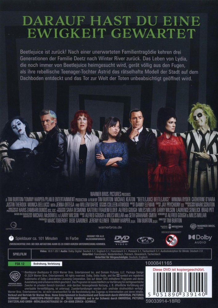 Beetlejuice (Michael Keaton) ist wieder da! Nach einer unerwarteten Familientragödie kehren drei Generationen der Familie Deetz nach 'Winter River' zurück. Das Leben von Lydia Deetz (Winona Ryder), die noch immer von Beetlejuice heimgesucht wird, gerät völlig aus den Fugen, als ihre rebellische Teenager-Tochter Astrid (Jenna Ortega das rätselhafte Modell der Stadt auf dem Dachboden entdeckt und das Tor zur Welt der Toten unbeabsichtigt geöffnet wird. Sowohl im Diesseits als auch im Jenseits braut sich alsbald Unheil zusammen. Nur eine Frage der Zeit also, bis jemand den Namen 'Beetlejuice' dreimal ausspricht und der spitzbübische Dämon zurückkehrt, um seine ganz eigene Art von Chaos zu verbreiten... Beetlejuice ist zurück: Der Oscar-nominierte, einzigartige Kreativ-Visionär Tim Burton und Oscar-Kandidat und Hauptdarsteller Michael Keaton haben sich erneut zusammengetan. 'Beetlejuice 2 - Beetlejuice Beetlejuice' (2024) ist die lang erwartete Fortsetzung von Burtons preisgekröntem Klassiker 'Beetlejuice'. Keaton schlüpft einmal mehr in die kultige Rolle der Titelfigur. Auch Oscar-Kandidatin Winona Ryder ('Stranger Things', 'Little Women') als Lydia Deetz sowie die zweifache Emmy-Preisträgerin Catherine O'Hara ('Schitt's Creek', 'Corpse Bride - Hochzeit mit einer Leiche') als Delia Deetz gehören wieder zum Cast. Neu im Schauspielensemble sind Justin Theroux ('Star Wars - Episode VIII - Die letzten Jedi', 'The Leftovers'), Monica Bellucci ('James Bond 007 - Spectre', 'Matrix' Filme), Arthur Conti ('House of the Dragon') in seinem Spielfilmdebüt, die Emmy-nominierte Jenna Ortega ('Wednesday', 'Scream 6') als Lydias Tochter Astrid sowie Oscar-Kandidat Willem Dafoe ('Poor Things', 'Van Gogh - An der Schwelle zur Ewigkeit'). Tim Burton hat sich längst sein eigenes Genre geschaffen. Bei 'Beetlejuice Beetlejuice' führte er Regie nach einem Drehbuch von Alfred Gough und Miles Millar ('Wednesday'), das auf einer Story von Gough & Millar und Seth Grahame-Smith ('The LEGO Batman Movie') basiert. Die darin enthaltenen Figuren wiederum erschufen Michael McDowell und Larry Wilson. Produziert wurde der Film von Marc Toberoff, Dede Gardner, Jeremy Kleiner, Tommy Harper und Burton. Die ausführende Produktion übernahmen Sara Desmond, Katterli Frauenfelder, Gough, Millar, Brad Pitt, Larry Wilson, Laurence Senelick, Pete Chiappetta, Andrew Lary, Anthony Tittanegro, Grahame-Smith und David Katzenberg. Zu Burtons Kreativteam gehörten Kameramann Haris Zambarloukos ('Meg 2 - Die Tiefe', 'Mord m Orient-Express') sowie eine Reihe von langjährigen und regelmäßigen Mitarbeiterinnen und Mitarbeitern, darunter Produktionsdesigner Mark Scruton ('Wednesday'), Editor Jay Prychidny ('Wednesday'), die Oscar-prämierte Kostümdesignerin Colleen Atwood ('Alice im Wunderland', 'Sweeney Todd - Der teuflische Barbier aus der Fleet Street', 'Sleepy Hollow'), der Oscar-ausgezeichnete Creative-Supervisor für Creature-Effects und Special-Make-up-FX Neal Scanlan ('Sweeney Todd', 'Charlie und die Schokoladenfabrik'), der Oscar-nominierte Komponist Danny Elfman ('Big Fish - Der Zauber, der ein Leben zur Legende macht', 'Nightmare Before Christmas', 'Batman') sowie die Oscar-prämierte Hair- und Make-up-Designerin Christine Blundell ('Topsy-Turvy - Auf den Kopf gestellt'). 'Beetlejuice Beetlejuice' wird von Warner Bros. Pictures präsentiert. Der Start im Kino und in IMAX-Theatern ist international ab dem 4. September 2024 vorgesehen. In Deutschland startet der Film am 12. September 2024 auf der Kinoleinwand.