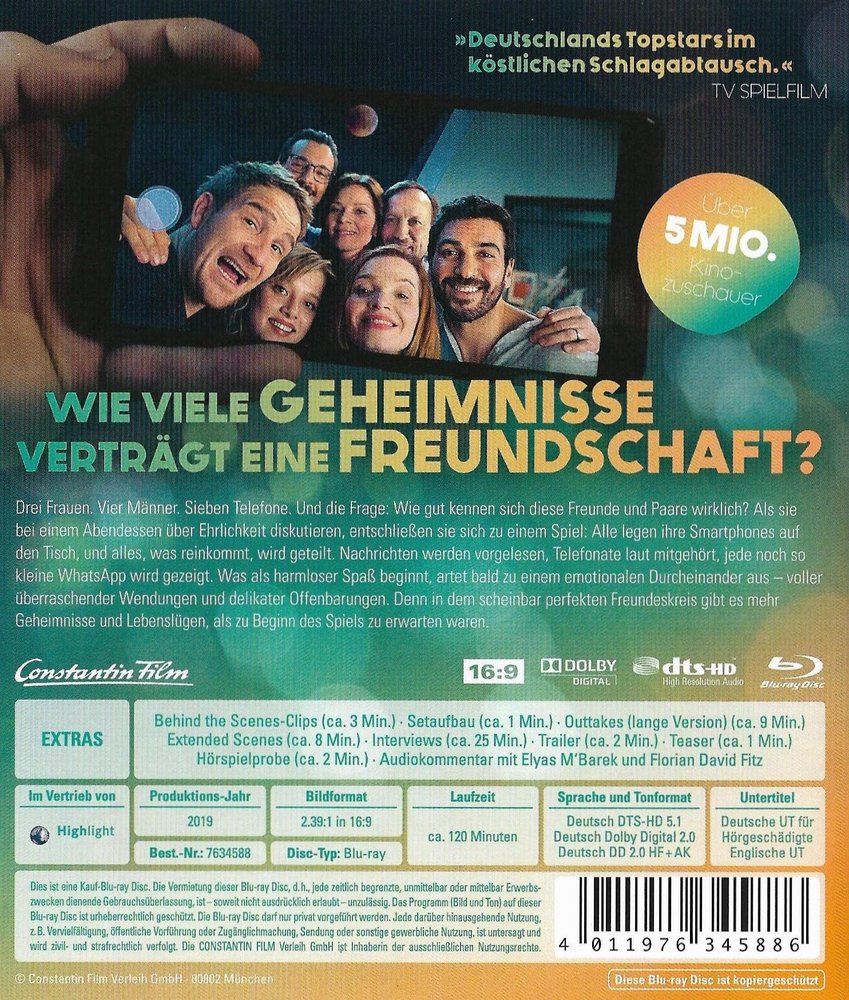 Drei Frauen. Vier Männer. Sieben Telefone. Und die Frage: Wie gut kennen wir unsere Liebsten wirklich? Bei einem Abendessen wird über Ehrlichkeit diskutiert. Spontan entschließen sich die Freunde zu einem Spiel. Alle legen ihre Smartphones auf den Tisch und alles, was ankommt, wird geteilt, Nachrichten werden vorgelesen, Telefonate mitgehört. Was als harmloser Spaß beginnt, artet bald zu einem großen Durcheinander aus - voller Überraschungen, Wendungen und Offenbarungen. Denn in dem scheinbar perfekten Freundeskreis gibt es mehr delikate Geheimnisse, als man am Anfang des Abends annehmen konnte... Wie viele Geheimnisse verträgt eine Freundschaft? In seiner enorm erfolgreichen Kinokomödie 'Das perfekte Geheimnis' (2019) zeigt Bora Dagtekin, dass gute Freunde wenig voneinander wissen, ihre Mobiltelefone dafür umso mehr. Autor und Regisseur Dagtekin und Produzentin Lena Schömann lassen in 'Das perfekte Geheimnis' einen Abend unter Freunden eskalieren und bringen dafür ein einmaliges Star-Ensemble an einen Tisch: Elyas M'Barek, Florian David Fitz, Jella Haase, Karoline Herfurth, Frederick Lau, Wotan Wilke Möhring sowie Jessica Schwarz spielen die Hauptrollen in der Komödie, die am 31. Oktober 2019 in den deutschen Kinos startete. Die Komödie wurde in München gedreht, ist eine 'Constantin Film' Produktion und wurde vom FilmFernsehFonds Bayern 'FFF', Medienboard Berlin-Brandenburg 'MBB', der Filmförderungsanstalt 'FFA' sowie dem Deutschen Filmförderfonds 'DFFF' gefördert. Executive-Producer war Martin Moszkowicz. Für den Deutschen Filmpreis 2020 erhielt 'Das perfekte Geheimnis' die Auszeichnung 'Besucherstärkster Film' des Jahres.