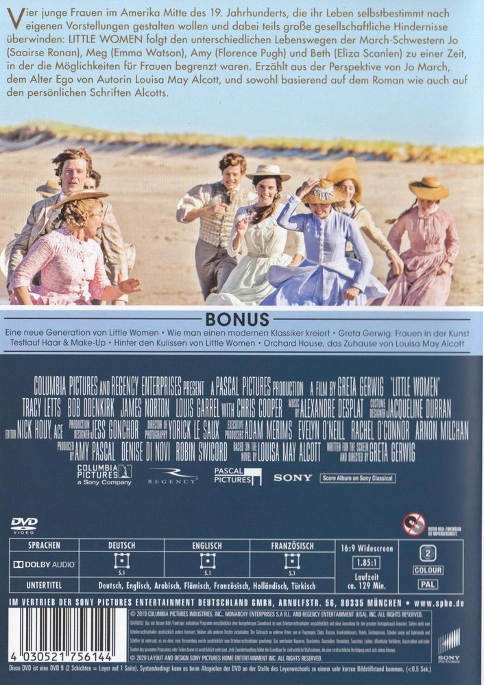 'Little Women' erzählt von den Wünschen, Träumen und Gefühlen von vier jungen Frauen zur Mitte des 19. Jahrhunderts, die heute so modern wirken wie je zuvor. Regisseurin und Drehbuchautorin Greta Gerwig gelingt mit ihrer Adaption ein wahrhaft außergewöhnlicher Film voller Leidenschaft und Energie: Vier junge Frauen im Amerika Mitte des 19. Jahrhunderts, die ihr Leben selbstbestimmt nach eigenen Vorstellungen gestalten wollen und dabei teils große gesellschaftliche Hindernisse überwinden. 'Little Women' folgt den unterschiedlichen Lebenswegen der March-Schwestern Jo (Saoirse Ronan), Meg (Emma Watson), Amy (Florence Pugh) und Beth (Eliza Scanlen) zu einer Zeit, in der die Möglichkeiten für Frauen begrenzt waren. Erzählt aus der Perspektive von Jo March, dem Alter Ego von Autorin Louisa May Alcott, und sowohl basierend auf dem Roman wie auch auf den persönlichen Schriften Alcotts... Greta Gerwig, Oscar-nominiert für die beste Regie und das beste Originaldrehbuch für 'Lady Bird' (2017), präsentiert mit 'Little Women' (2019) ihr neuestes Werk und erweist sich damit abermals als kraftvolle Interpretin weiblichen Selbstverständnisses. In den Hauptrollen begeistert ein eindrucksvolles Ensemble: Saoirse Ronan (aus 'Lady Bird'), Emma Watson ('Die Schöne und das Biest'), Florence Pugh ('Fighting with My Family') und Eliza Scanlen ('Sharp Objects') sowie Meryl Streep ('Die Verlegerin'), Laura Dern ('Big Little Lies'), Timothée Chalamet ('Call Me by Your Name'), Louis Garrel ('Saint Laurent'), James Norton ('Hampstead Park - Aussicht auf Liebe'), Bob Odenkirk ('Better Call Saul') und Chris Cooper ('Im August in Osage County'). Produziert wurde 'Little Women' von Amy Pascal (siehe auch 'Die Verlegerin'), Denise Di Novi ('Crazy, Stupid, Love') und Robin Swicord ('Betty und ihre Schwestern'). Dies ist die 2019er Neuverfilmung des Klassikers 'Little Women' nach der Romanvorlage von Louisa May Alcott (1832-1888), hier unter der Regie von Greta Gerwig (siehe zuvor ihr gefeiertes Regiewerk 'Lady Bird' von 2017). Der deutsche Kinostart ist von 'Sony Pictures' zum 30. Januar 2020 geplant.
