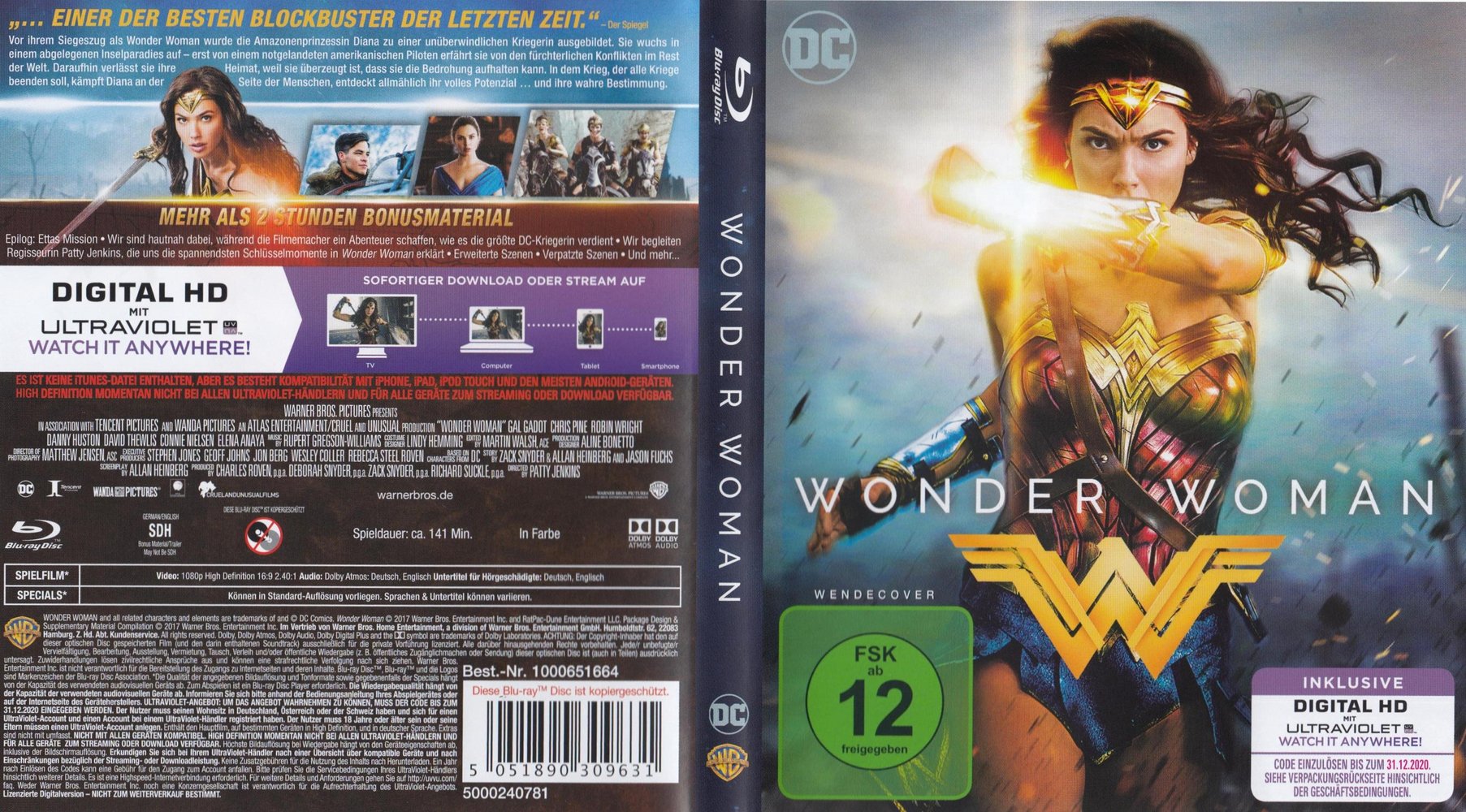 Vor ihrem Siegeszug als 'Wonder Woman' wurde die Amazonenprinzessin Diana (Gal Gadot) zu einer unüberwindlichen Kriegerin ausgebildet. Sie wuchs in einem abgelegenen Inselparadies auf, erst von dem notgelandeten amerikanischen Piloten Steve Trevor (Chris Pine) erfährt sie von den fürchterlichen Konflikten im Rest der Welt. Darauf verlässt sie ihre Heimat, weil sie überzeugt ist, dass sie der bedrohlichen Situation Herr werden kann. In dem Krieg, der alle Kriege beenden soll, kämpft Diana an der Seite der Menschen, entdeckt allmählich ihr volles Potenzial und ihre wahre Bestimmung... DC-Comics-Heldin 'Wonder Woman' kam im Sommer 2017 weltweit in die Kinos, als Gal Gadot in diesem epischen Action-Abenteuer auf die Leinwand zurückkehrte. Regie führte Patty Jenkins ('Monster' 2003). Gadot wurde unterstützt von einer internationalen Besetzung, darunter Chris Pine als Steve Trevor, Robin Wright als Antiope, Connie Nielsen als Hippolyta, David Thewlis als Sir Patrick, Danny Huston als Ludendorff, Elena Anaya als Dr. Maru, Ewen Bremner als Charlie und Saïd Taghmaoui als Sameer. Filmemacherin Jenkins inszenierte das Drehbuch von Allan Heinberg und Geoff Johns nach der Story von Zack Snyder und Allan Heinberg sowie den Figuren von 'DC Entertainment'. Die Superheldenfigur 'Wonder Woman' selbst wurde von William Moulton Marston konzipiert. Produziert wurde der Film von Charles Roven, Zack Snyder, Deborah Snyder und Richard Suckle. Als Executive-Producers waren Rebecca Roven, Stephen Jones, Wesley Coller und Geoff Johns beteiligt. 'Wonder Woman' lief am 15. Juni 2017 in den deutschen Kinos an und startete anschließend hier im Verleihprogramm auch auf DVD, Blu-ray, Blu-ray 3D und 4k-UHD im Heimkino durch.