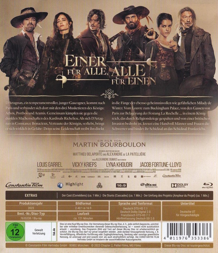 D'Artagnan (François Civil), ein temperamentvoller junger Gascogner, kommt nach Paris und verbündet sich dort mit den drei Musketieren des Königs: Athos (Vincent Cassel), Porthos (Pio Marmaï) und Aramis (Romain Duris). Gemeinsam kämpfen sie gegen die dunklen Machenschaften des Kardinals Richelieu (Eric Ruf). Als sich D'Artagnan in Constance Bonacieux (Lyna Khoudri), Vertraute der Königin, verliebt, bringt er sich wirklich in Gefahr. Denn seine Leidenschaft treibt ihn direkt in die Fänge der ebenso geheimnisvollen wie gefährlichen Milady de Winter (Eva Green)... Vom 'Louvre' zum 'Buckingham Palace', von den Gossen von Paris zur Belagerung der Festung 'La Rochelle', in einem Königreich, das durch Religionskriege gespalten und von einer britischen Invasion bedroht ist, kreuzen eine Handvoll Männer und Frauen in 'Die drei Musketiere - D'Artagnan' (2023) unter der Regie von Martin Bourboulon die Schwerter und binden ihr Schicksal an das Schicksal Frankreichs.