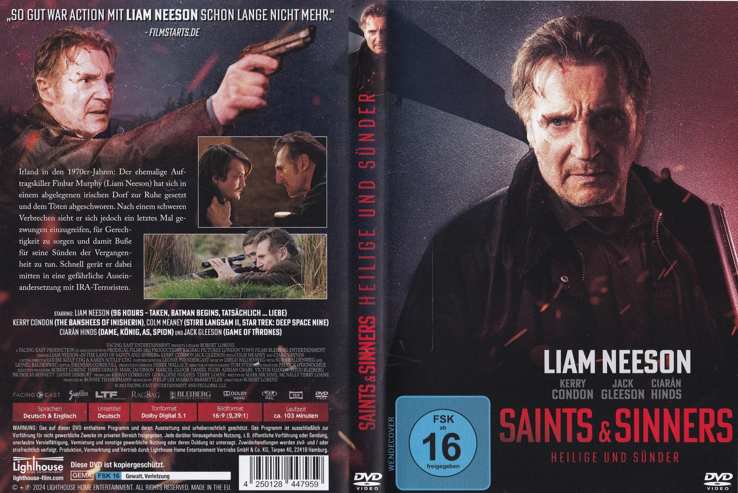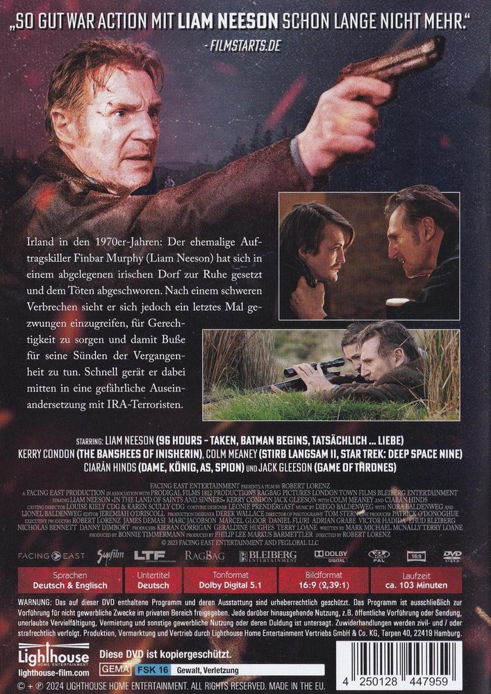 Irland in den 1970er Jahren. Der ehemalige Auftragskiller Finbar Murphy (Liam Neeson) hat sich in einem abgelegenen irischen Dorf zur Ruhe gesetzt und dem Töten abgeschworen. Nach einem schweren Verbrechen sieht er sich jedoch ein letztes Mal gezwungen einzugreifen, für Gerechtigkeit zu sorgen und damit Buße für seine Sünden der Vergangenheit zu tun. Schnell gerät er dabei mitten in eine gefährliche Auseinandersetzung mit IRA-Terroristen... Zu erleben im Actionthriller 'Saints & Sinners - Heilige und Sünder' alias 'In the Land of Saints and Sinners' (2023), der seine Weltpremiere am 6. September 2023 bei den 80. Internationalen Filmfestspielen von Venedig feierte. Starbesetzt mit Liam Neeson als Finbar Murphy, Kerry Condon als Doireann McCann, Colm Meaney als Robert McQue, Ciarán Hinds als Vincent O'Shea, Jack Gleeson als Kevin Lynch, Desmond Eastwood als Curtis June, Conor MacNeill als Conan McGrath, Seamus O'Hara als Séamus McKenna und Sarah Greene als Sinéad Dougan unter der Regie von Robert Lorenz.