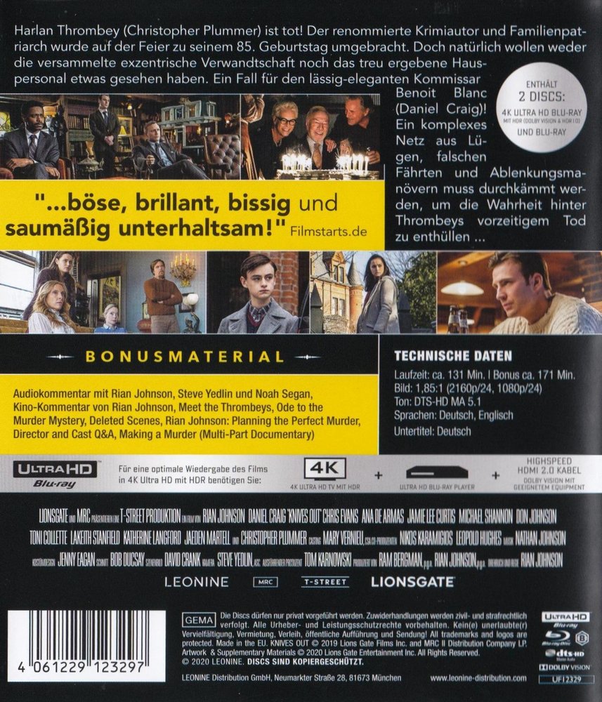 Harlan Thrombey (Christopher Plummer) ist tot. Und nicht nur das, der renommierte Krimiautor und Familienpatriarch wurde auf der Feier zu seinem 85. Geburtstag umgebracht. Doch natürlich wollen weder die versammelte exzentrische Verwandtschaft noch das treu ergebene Hauspersonal und seine Pflegerin Marta Cabrera (Ana de Armas) etwas gesehen haben. Ein Fall für Benoit Blanc (Daniel Craig). Der lässig-elegante Kommissar beginnt seine Ermittlungen und während sich sämtliche anwesenden Gäste alles andere als kooperativ zeigen, spitzt sich die Lage zu und das Misstrauen untereinander wächst. Ein komplexes Netz aus Lügen, falschen Fährten und Ablenkungsmanövern muss durchkämmt werden, um die Wahrheit hinter Thrombeys vorzeitigem Tod zu enthüllen... Von Autor und Regisseur Rian Johnson (siehe zuvor 'Brick', 'Looper' oder zuletzt 'Star Wars - Episode VIII - Die letzten Jedi' 2017) verbeugt sich mit seiner Krimiverfilmung 'Knives Out - Mord ist Familiensache' (2019) vor der Grande Dame des Kriminalromans Agatha Christie, in einer amüsanten wie mysteriösen Mordsgeschichte, in der jede(r) Beteiligte zu den Verdächtigen zählt, beim Mord an Harlan Thrombey (Christopher Plummer) an seinem 85. Geburtstag. Detektiv Benoit Blanc (Daniel Craig) soll daraufhin die Untersuchung übernehmen, mit einer Starriege an möglichen Tätern, darunter Chris Evans, Ana de Armas, Jamie Lee Curtis, Don Johnson, Michael Shannon, Toni Collette, LaKeith Stanfield, Katherine Langford und Jaeden Martell, bei der US-Kinopremiere am 27. November 2019 und dem deutschen Kinostart am 2. Januar 2020.