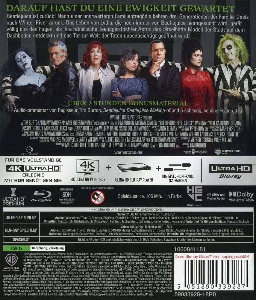 Beetlejuice (Michael Keaton) ist wieder da! Nach einer unerwarteten Familientragödie kehren drei Generationen der Familie Deetz nach 'Winter River' zurück. Das Leben von Lydia Deetz (Winona Ryder), die noch immer von Beetlejuice heimgesucht wird, gerät völlig aus den Fugen, als ihre rebellische Teenager-Tochter Astrid (Jenna Ortega das rätselhafte Modell der Stadt auf dem Dachboden entdeckt und das Tor zur Welt der Toten unbeabsichtigt geöffnet wird. Sowohl im Diesseits als auch im Jenseits braut sich alsbald Unheil zusammen. Nur eine Frage der Zeit also, bis jemand den Namen 'Beetlejuice' dreimal ausspricht und der spitzbübische Dämon zurückkehrt, um seine ganz eigene Art von Chaos zu verbreiten... Beetlejuice ist zurück: Der Oscar-nominierte, einzigartige Kreativ-Visionär Tim Burton und Oscar-Kandidat und Hauptdarsteller Michael Keaton haben sich erneut zusammengetan. 'Beetlejuice 2 - Beetlejuice Beetlejuice' (2024) ist die lang erwartete Fortsetzung von Burtons preisgekröntem Klassiker 'Beetlejuice'. Keaton schlüpft einmal mehr in die kultige Rolle der Titelfigur. Auch Oscar-Kandidatin Winona Ryder ('Stranger Things', 'Little Women') als Lydia Deetz sowie die zweifache Emmy-Preisträgerin Catherine O'Hara ('Schitt's Creek', 'Corpse Bride - Hochzeit mit einer Leiche') als Delia Deetz gehören wieder zum Cast. Neu im Schauspielensemble sind Justin Theroux ('Star Wars - Episode VIII - Die letzten Jedi', 'The Leftovers'), Monica Bellucci ('James Bond 007 - Spectre', 'Matrix' Filme), Arthur Conti ('House of the Dragon') in seinem Spielfilmdebüt, die Emmy-nominierte Jenna Ortega ('Wednesday', 'Scream 6') als Lydias Tochter Astrid sowie Oscar-Kandidat Willem Dafoe ('Poor Things', 'Van Gogh - An der Schwelle zur Ewigkeit'). Tim Burton hat sich längst sein eigenes Genre geschaffen. Bei 'Beetlejuice Beetlejuice' führte er Regie nach einem Drehbuch von Alfred Gough und Miles Millar ('Wednesday'), das auf einer Story von Gough & Millar und Seth Grahame-Smith ('The LEGO Batman Movie') basiert. Die darin enthaltenen Figuren wiederum erschufen Michael McDowell und Larry Wilson. Produziert wurde der Film von Marc Toberoff, Dede Gardner, Jeremy Kleiner, Tommy Harper und Burton. Die ausführende Produktion übernahmen Sara Desmond, Katterli Frauenfelder, Gough, Millar, Brad Pitt, Larry Wilson, Laurence Senelick, Pete Chiappetta, Andrew Lary, Anthony Tittanegro, Grahame-Smith und David Katzenberg. Zu Burtons Kreativteam gehörten Kameramann Haris Zambarloukos ('Meg 2 - Die Tiefe', 'Mord m Orient-Express') sowie eine Reihe von langjährigen und regelmäßigen Mitarbeiterinnen und Mitarbeitern, darunter Produktionsdesigner Mark Scruton ('Wednesday'), Editor Jay Prychidny ('Wednesday'), die Oscar-prämierte Kostümdesignerin Colleen Atwood ('Alice im Wunderland', 'Sweeney Todd - Der teuflische Barbier aus der Fleet Street', 'Sleepy Hollow'), der Oscar-ausgezeichnete Creative-Supervisor für Creature-Effects und Special-Make-up-FX Neal Scanlan ('Sweeney Todd', 'Charlie und die Schokoladenfabrik'), der Oscar-nominierte Komponist Danny Elfman ('Big Fish - Der Zauber, der ein Leben zur Legende macht', 'Nightmare Before Christmas', 'Batman') sowie die Oscar-prämierte Hair- und Make-up-Designerin Christine Blundell ('Topsy-Turvy - Auf den Kopf gestellt'). 'Beetlejuice Beetlejuice' wird von Warner Bros. Pictures präsentiert. Der Start im Kino und in IMAX-Theatern ist international ab dem 4. September 2024 vorgesehen. In Deutschland startet der Film am 12. September 2024 auf der Kinoleinwand.
