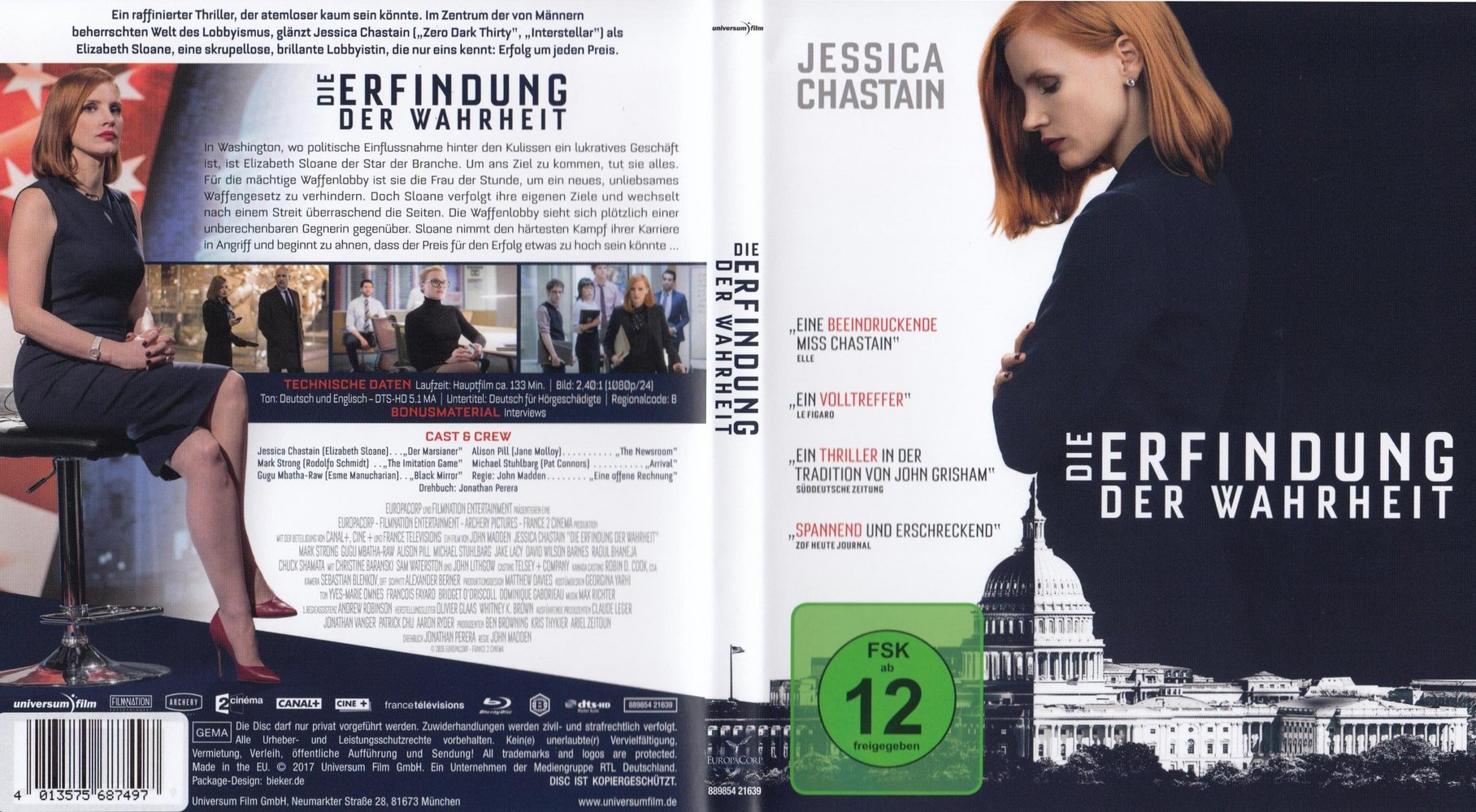In Washington, wo politische Einflussnahme hinter den Kulissen ein lukratives Geschäft ist, ist Elizabeth Sloane (Jessica Chastain) der Star der Branche. Die brillante, selbstsichere und völlig skrupellose Lobbyistin der alteingesessenen Kanzlei 'George Dupont' ist berüchtigt für ihr einzigartiges Talent, ihre Rücksichtslosigkeit und ihre zahllosen Erfolge. Um ans Ziel zu kommen, tut sie alles. Für die mächtige Waffenlobby ist sie die Frau der Stunde, um ein neues unliebsames Waffengesetz zu verhindern. Doch Sloane verfolgt ihre eigenen Ziele und wechselt nach einem Streit mit Dupont überraschend die Seiten. Die Waffenlobby sieht sich plötzlich einer unberechenbaren Gegnerin gegenüber. Sloane nimmt den härtesten Kampf ihrer Karriere in Angriff und beginnt zu ahnen, dass der Preis für den Erfolg etwas zu hoch sein könnte... 'Die Erfindung der Wahrheit' (2016) alias 'Miss Sloane', so der englische Originaltitel, ist ein raffinierter Politthriller, der atemloser kaum sein könnte. Im Zentrum, der von Männern beherrschten Welt des Lobbyismus, glänzt Golden-Globe-Gewinnerin Jessica Chastain (siehe u.a. 'Zero Dark Thirty' und 'A Most Violent Year') als Elizabeth Sloane, eine skrupellose, brillante Lobbyistin, die nur eins kennt: Erfolg um jeden Preis. Altmeister John Madden (siehe 'Best Exotic Marigold Hotel' und 'Shakespeare in Love') inszenierte einen grandiosen Thriller und führt mitten hinein in die Machenschaften, Intrigen und Machtpoker von Washington D.C., in weiteren Rollen spielen Mark Strong ('Dame, König, As, Spion'), John Lithgow ('The Crown') sowie Gugu Mbatha-Raw ('Jupiter Ascending').